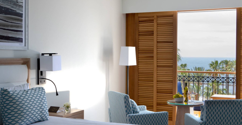 The hotel offers a range of accommodation options, from elegant rooms to suites, many with sea views and private balconies or terraces. Amenities include multiple swimming pools, tropical landscaped gardens, a state-of-the-art gym, and a spa.